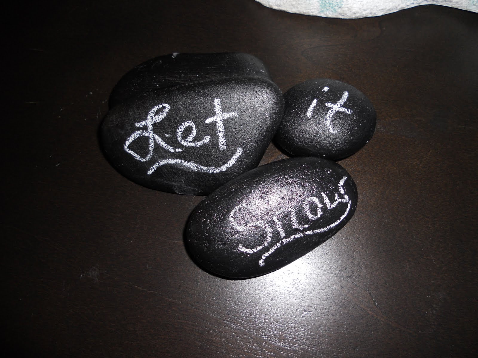 It's really very simple and I'm sure you've already figured out how to do them yourself...or you've seen a similar post out there in crafty blog land. LOL I acquired various flat medium and small rocks with the help of my children and the little littles (preschoolers). After I gave them a good scrub I painted them with chalkboard paint (I would have spray painted them but I was unable to find it...grrr - would have made this SO much easier; not that it wasn't already but let's be real I am lazy) I let the paint dry for 24 hrs and then rubbed the rocks down with chalk. Rinse off and dry then write your message. Here's my 'Let it Snow"